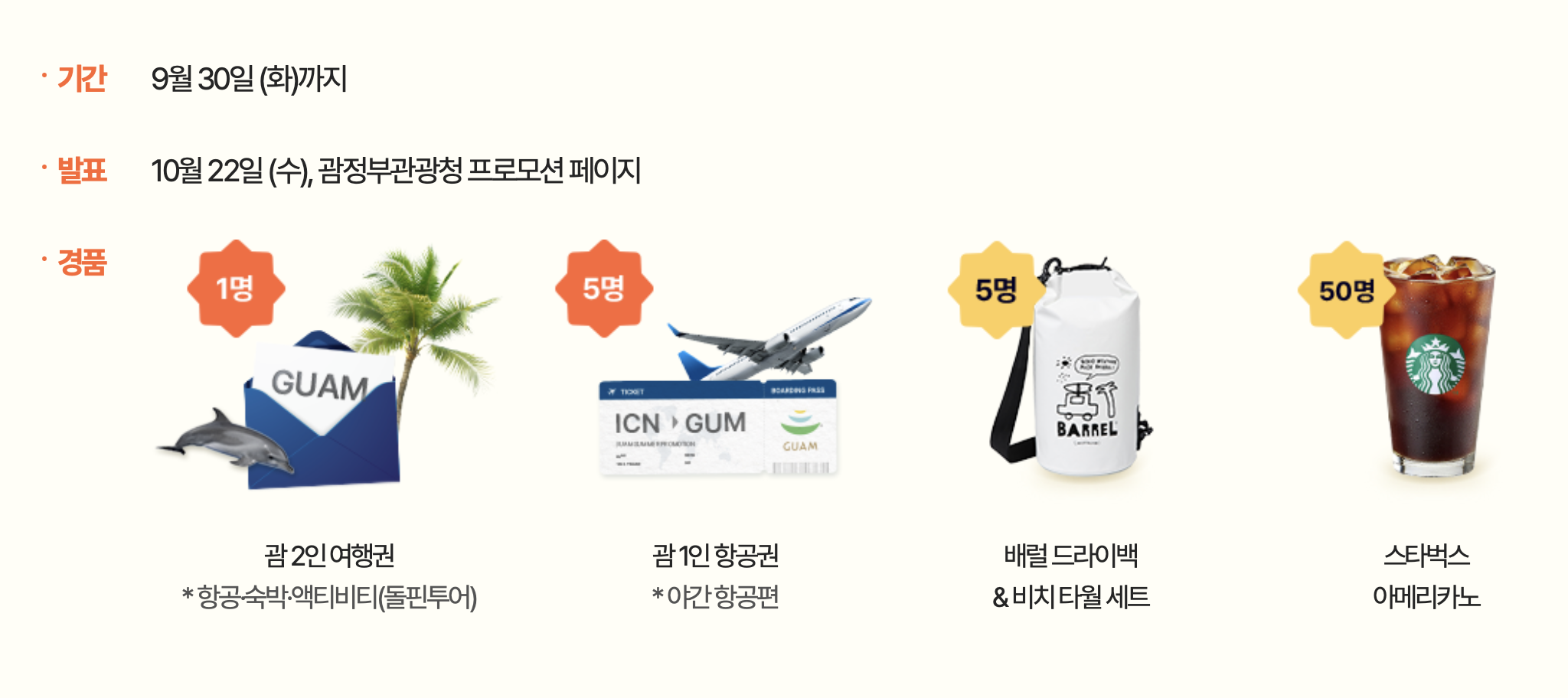 - 1등: 2인 괌 여행 패키지(왕복 항공권 + 호텔 숙박 + 돌핀 투어 포함)