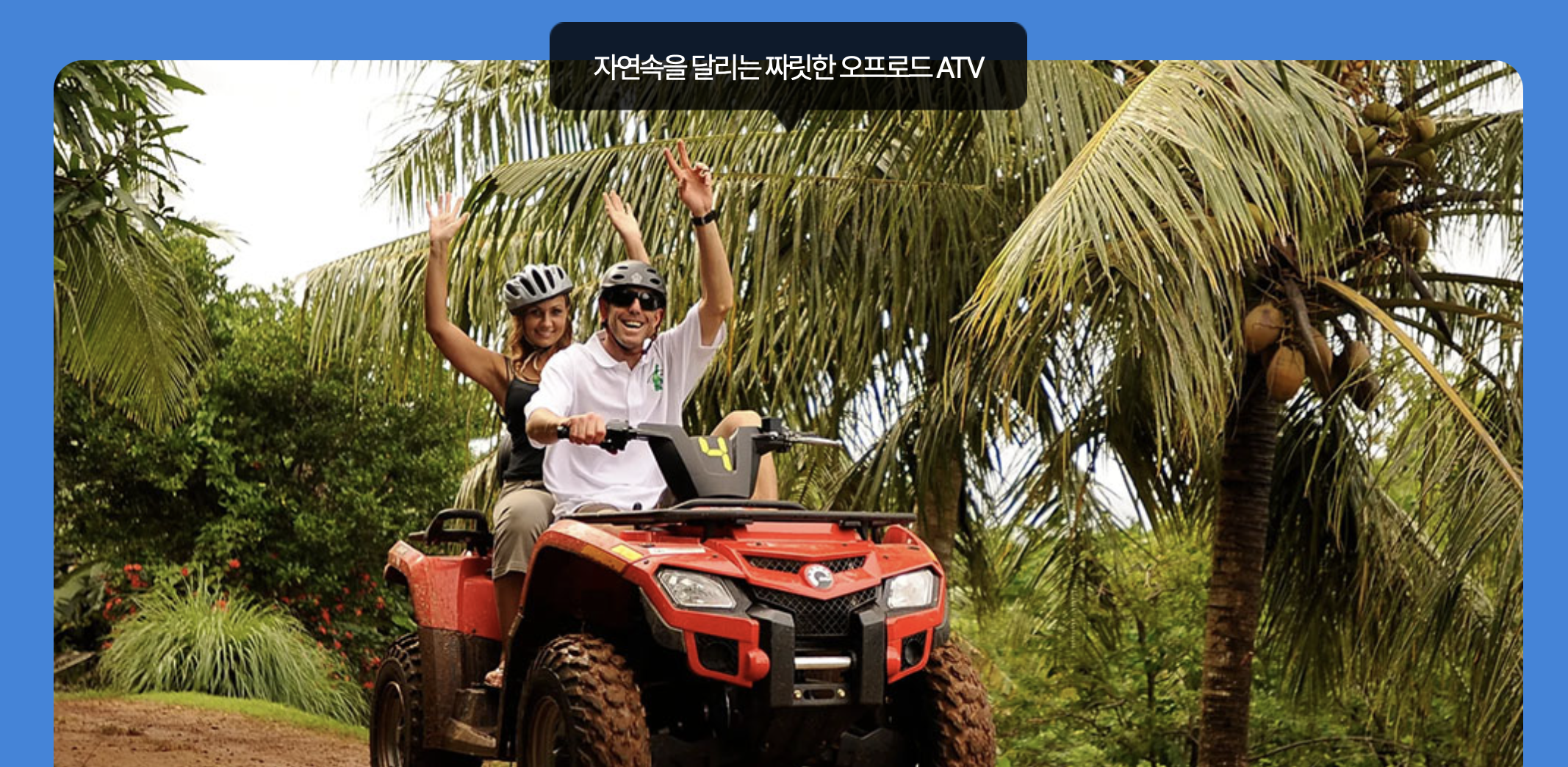 ATV 트레킹, 정글 트레일, 스카이다이빙까지 액티브한 일정으로 잊지 못할 하루를 설계할 수 있습니다.