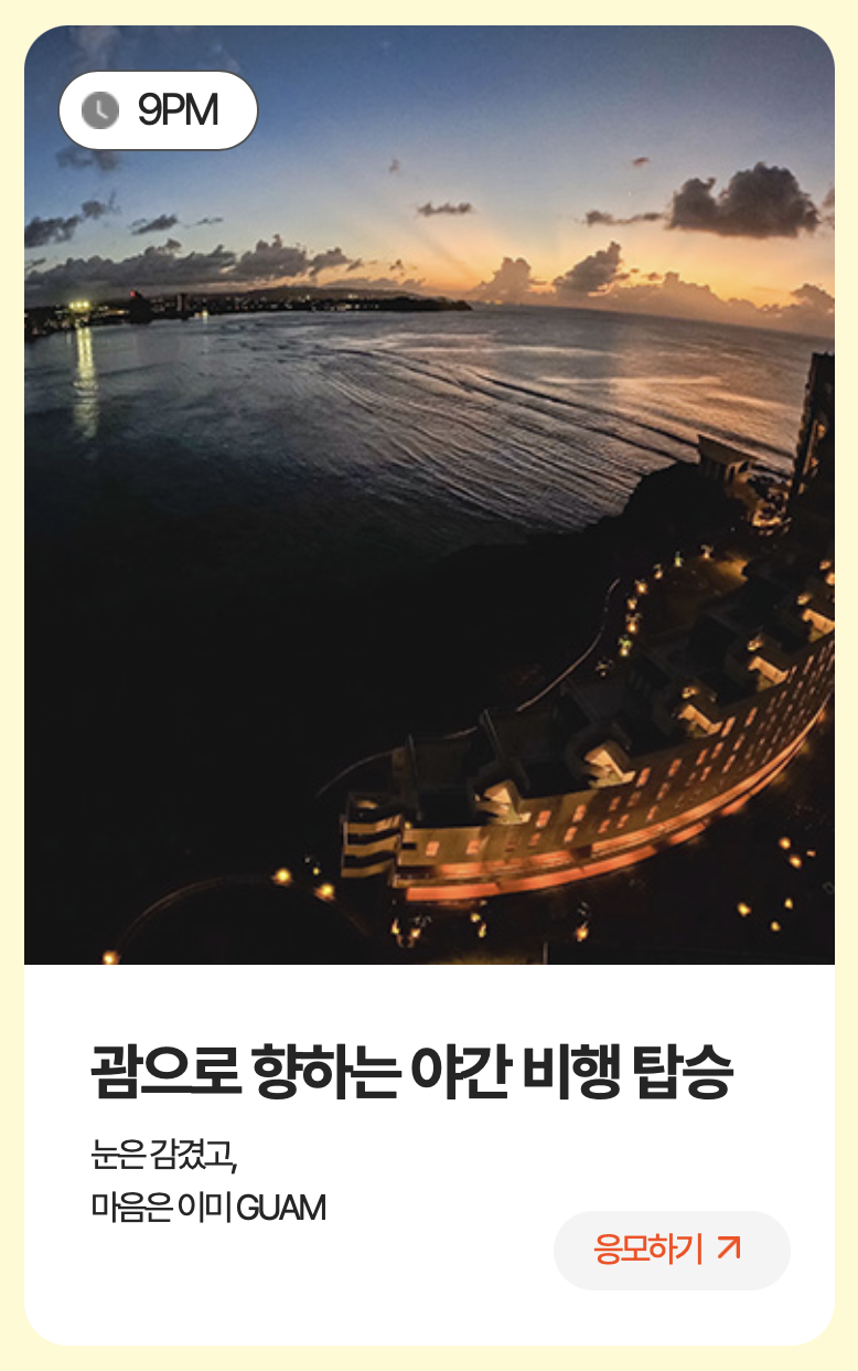 혹시 이벤트에 당첨되지 않더라도 심야 항공편만 잘 활용하면 시간·비용 모두를 절약하면서 알찬 괌 여행을 시작할 수 있습니다.