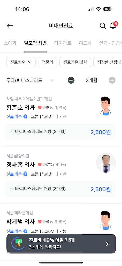 - 의료진·시간 선택 – 의사 목록에서 예약 가능 시간과 진료비를 확인합니다. (탈모 진료는 보통 2,500원 선)