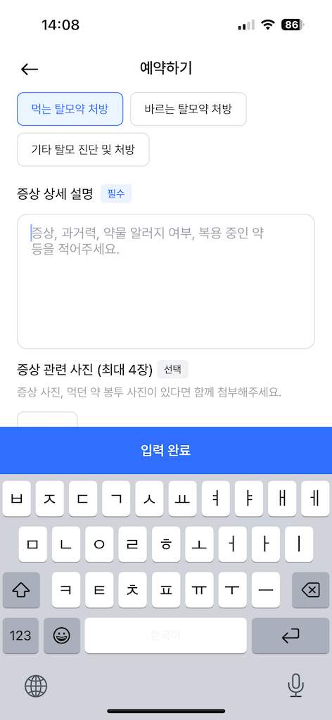 - 진료 항목 선택 – 앱에서 탈모 관련 항목을 고릅니다. (남편은 탈모 진료를 선택)