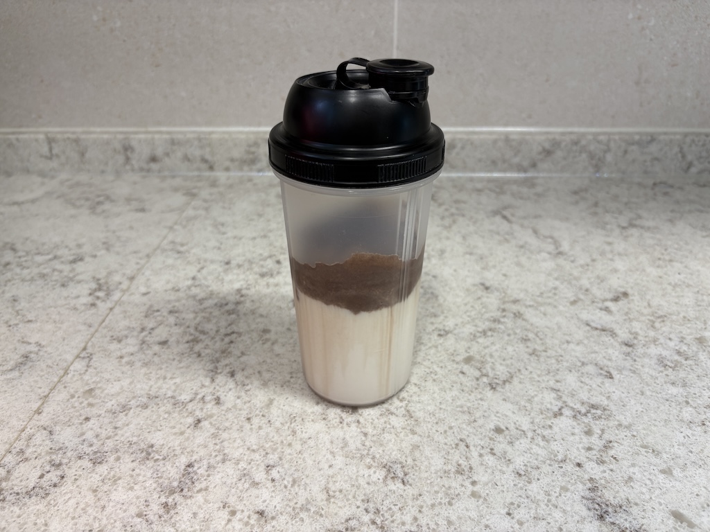 집에 하나씩은 가지고 계실 단백질 쉐이크 통에 우유나 물 200~250ml에 신타6 1스쿱을 타면 거지말 1g을 보태서 맛있는 초코 우유(초코물)가 됩니다.
