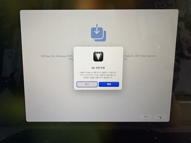 제가 처음 마이그레이션을 했을 때 유선 연결로 진행하고, 새 맥북에 약 90%까진 데이터가 전송됐는데, 그 이후로 전혀 진행되지 않던 문제가 있었습니다.