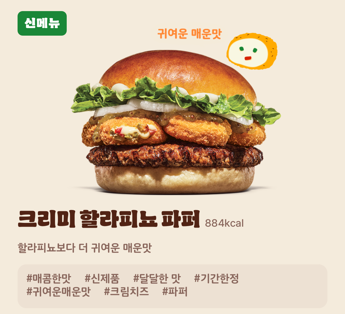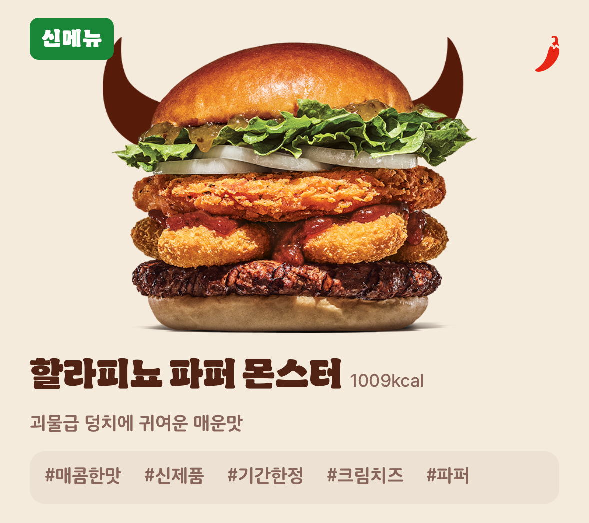 기존 구성에 더블 패티와 할라피뇨 토핑이 추가된 업그레이드 버전입니다.