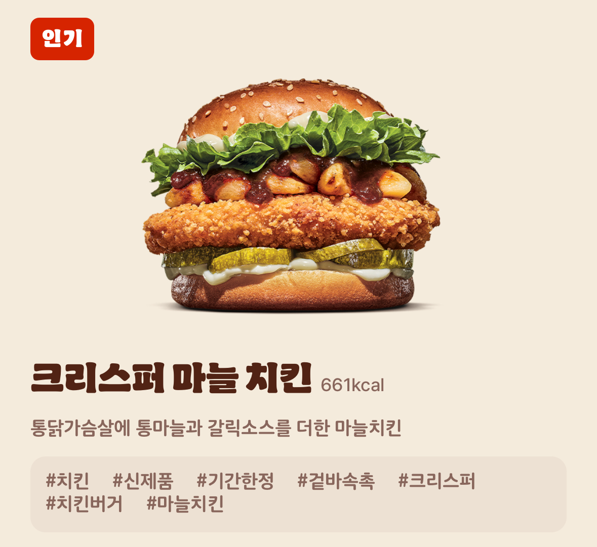 | 7위 | 크리스퍼 마늘 치킨 | 담백하고 고소한 치킨버거 |