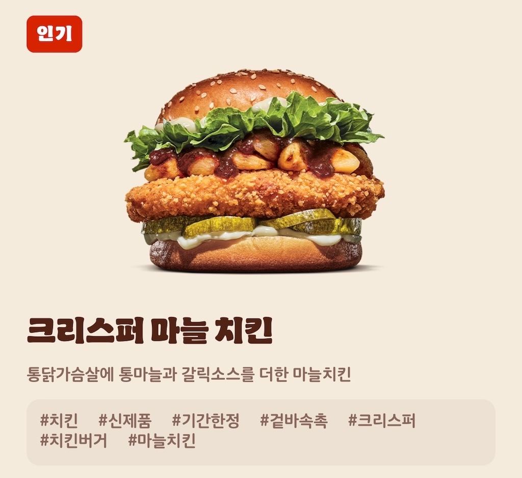 두툼한 닭가슴살 패티에 통마늘과 갈릭 소스를 더해 깊은 풍미를 느낄 수 있는 메뉴입니다.