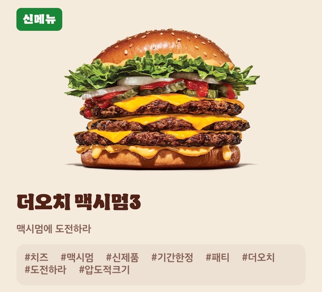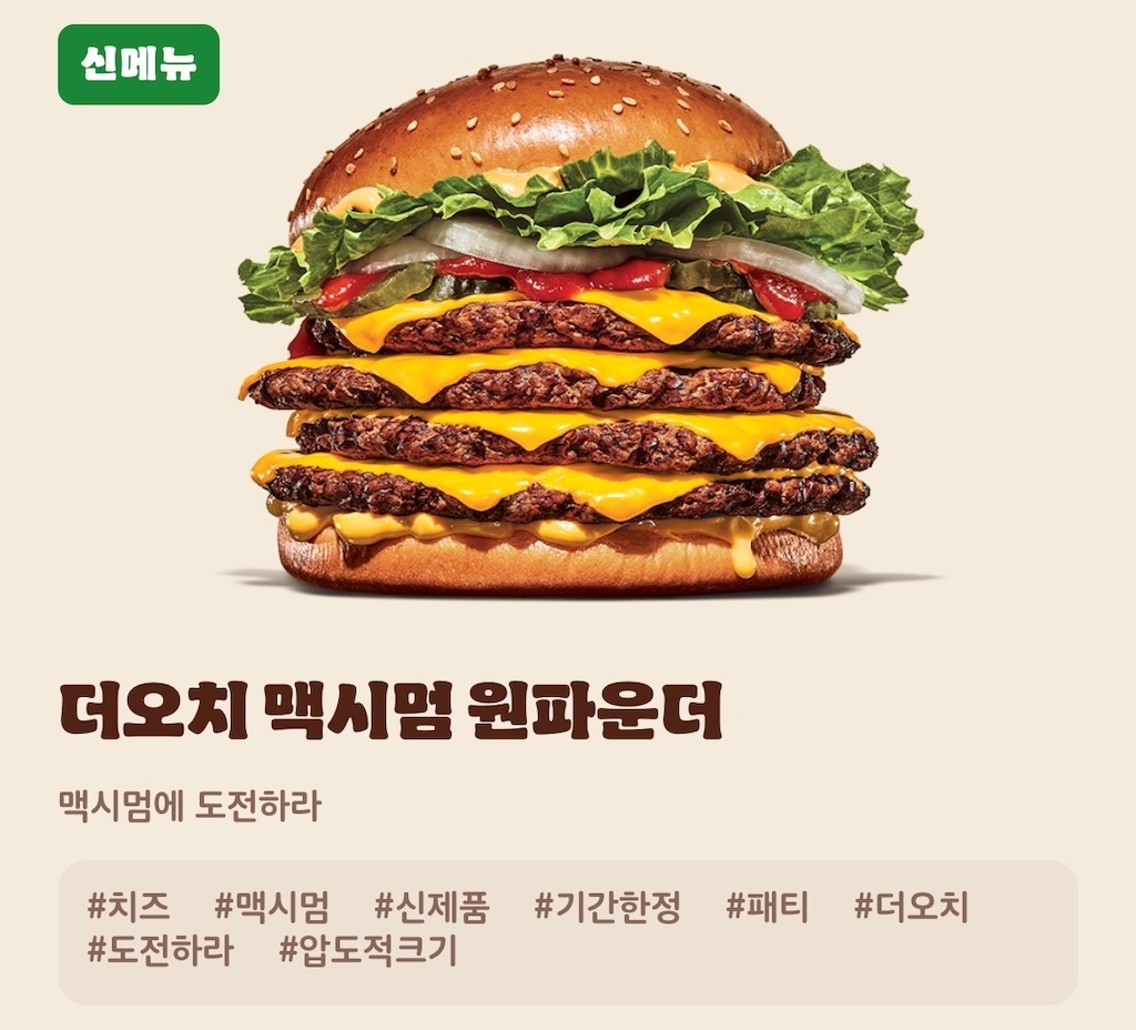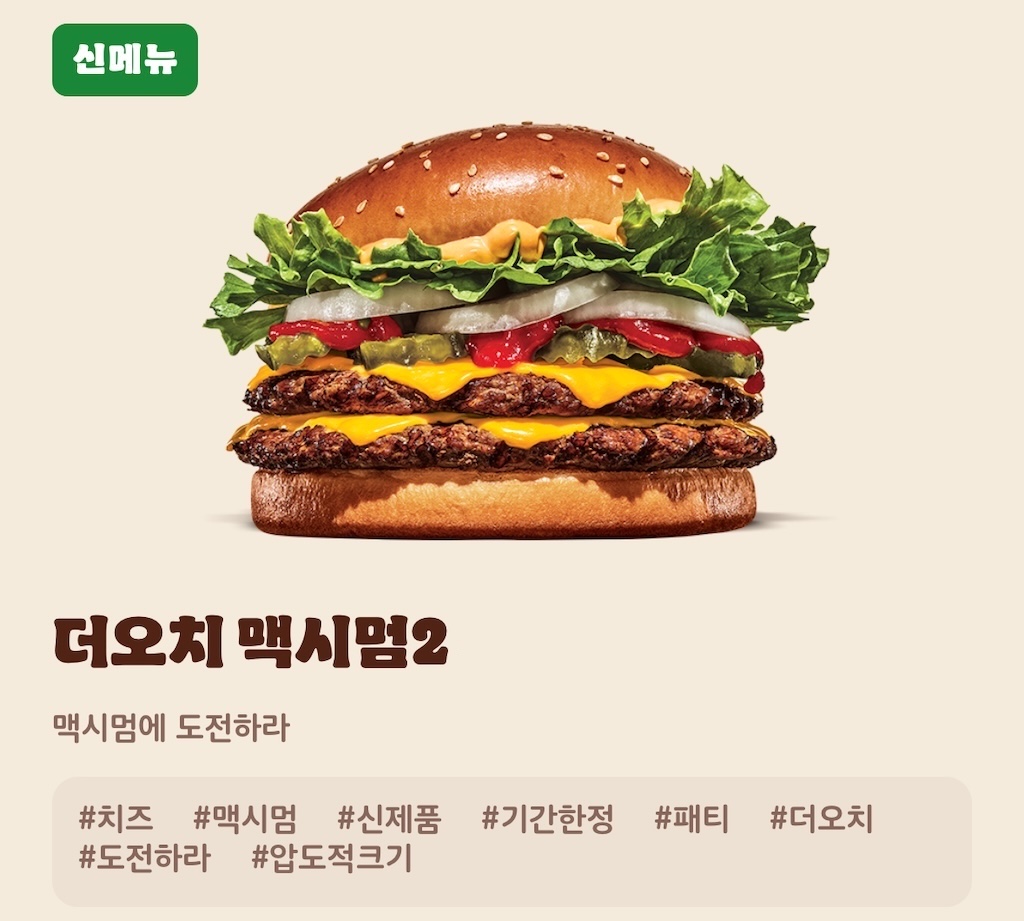 기간 한정으로 판매되는 신메뉴로, 압도적인 크기의 소고기 패티 2장과 치즈가 어우러진 버거입니다. 풍성한 고기 맛과 치즈의 조합으로 많은 분들에게 사랑받고 있습니다.