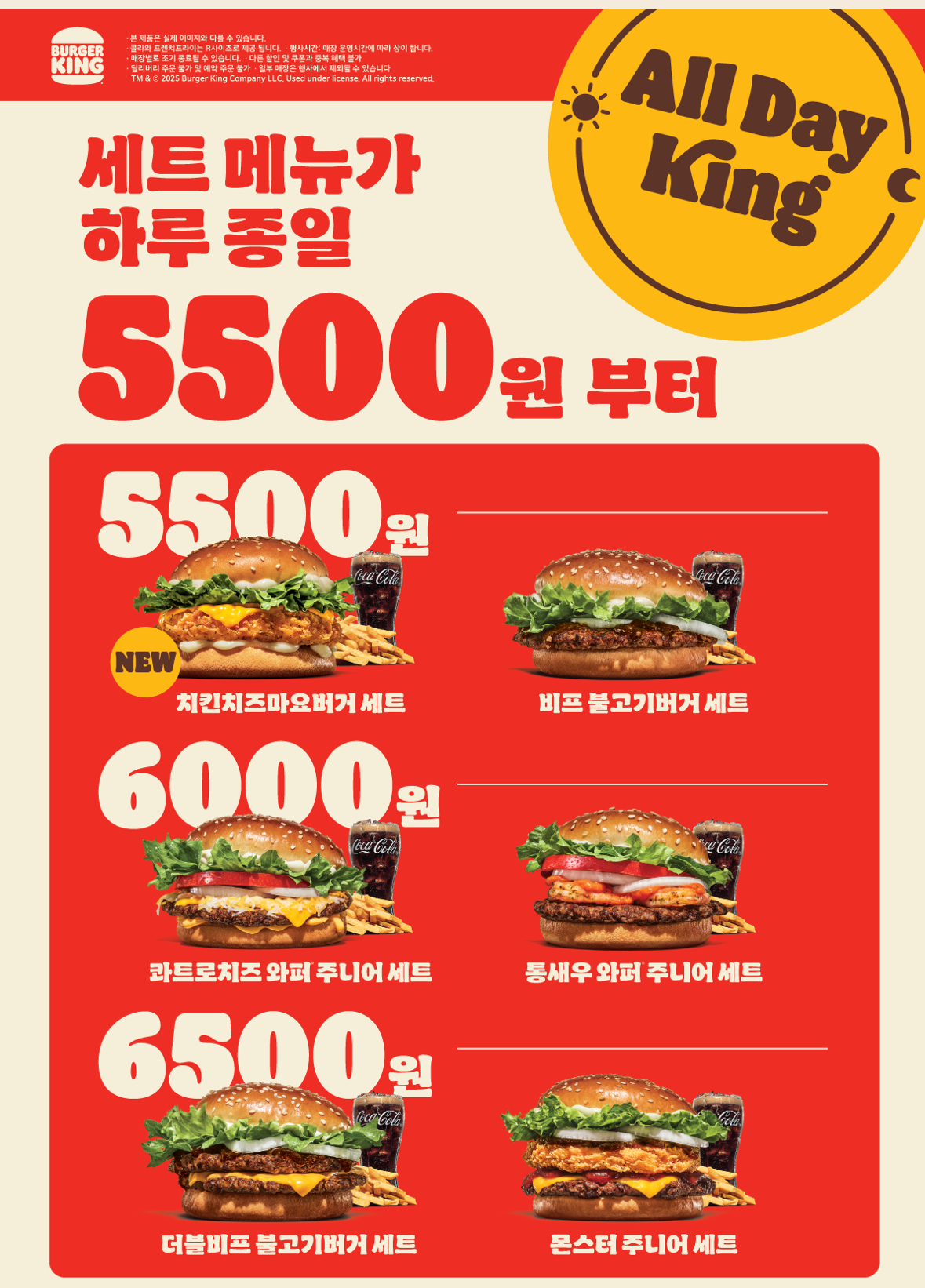 하루 종일 다양한 세트 메뉴를 5,500원부터 저렴하게 구매할 수 있는 이벤트로 유명하죠. 이번 달은 신제품 '치킨치즈마요버거 세트'를 5,500원이라는 합리적인 가격에 만나볼 수 있습니다. 콰트로치즈 와퍼 주니어 세트, 몬스터 주니어 세트도 행사에 포함됩니다.