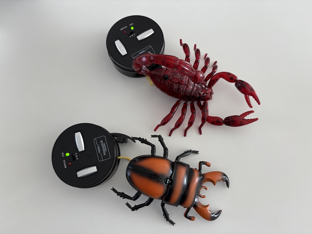 사슴벌레와 전갈 장난감이 1세트로 구성되어 있고, RC카처럼 수신기로 장난감을 조종할 수 있습니다.