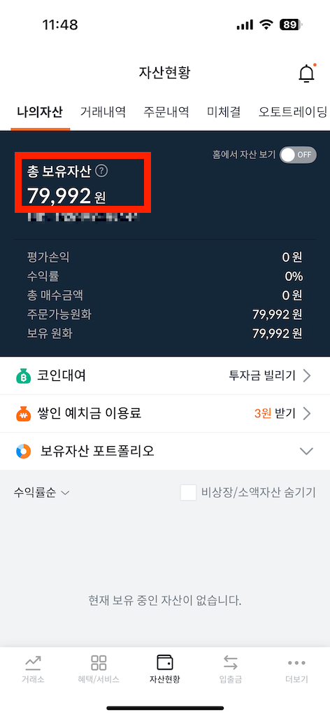 아래 제 빗썸 계정에 총 보유자산이 79,992원인 것 보이시죠?