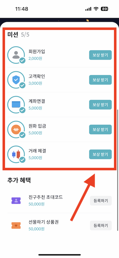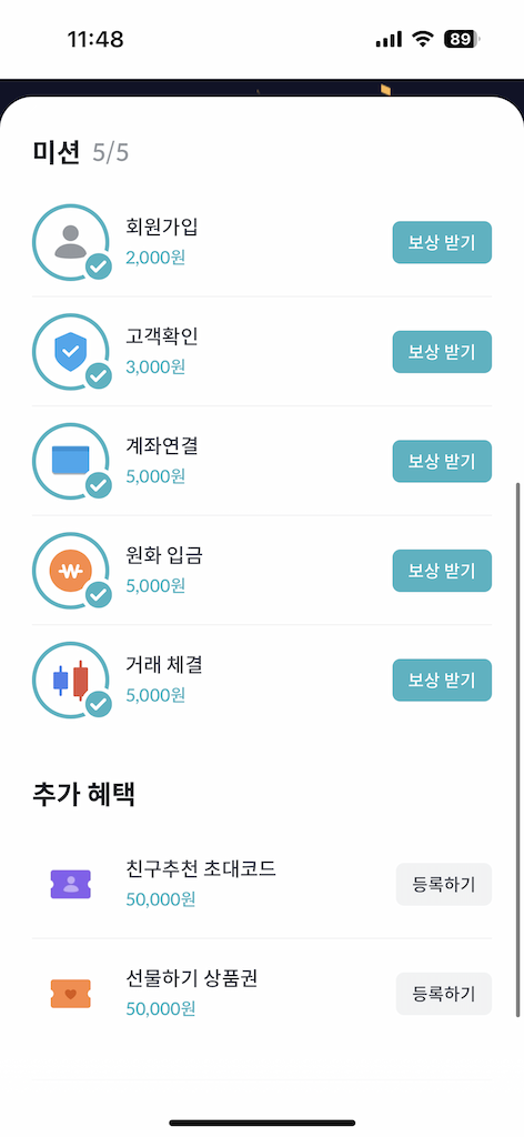 웰컴 미션 ①회원가입, ②고객확인(본인인증), ③계좌연결, ④원화 입금, ⑤거래 체결인데요.