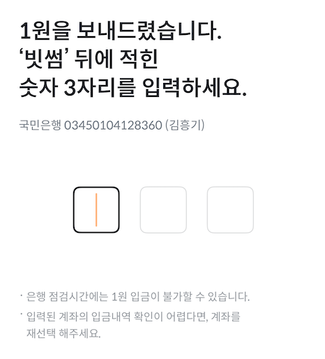 계좌 인증은 아무 은행이나 가능하지만 빗썸 계정은 국민은행 계좌만 연동이 되기 때문에 가급적이면 국민은행 계좌로 인증하는 것이 좋습니다.