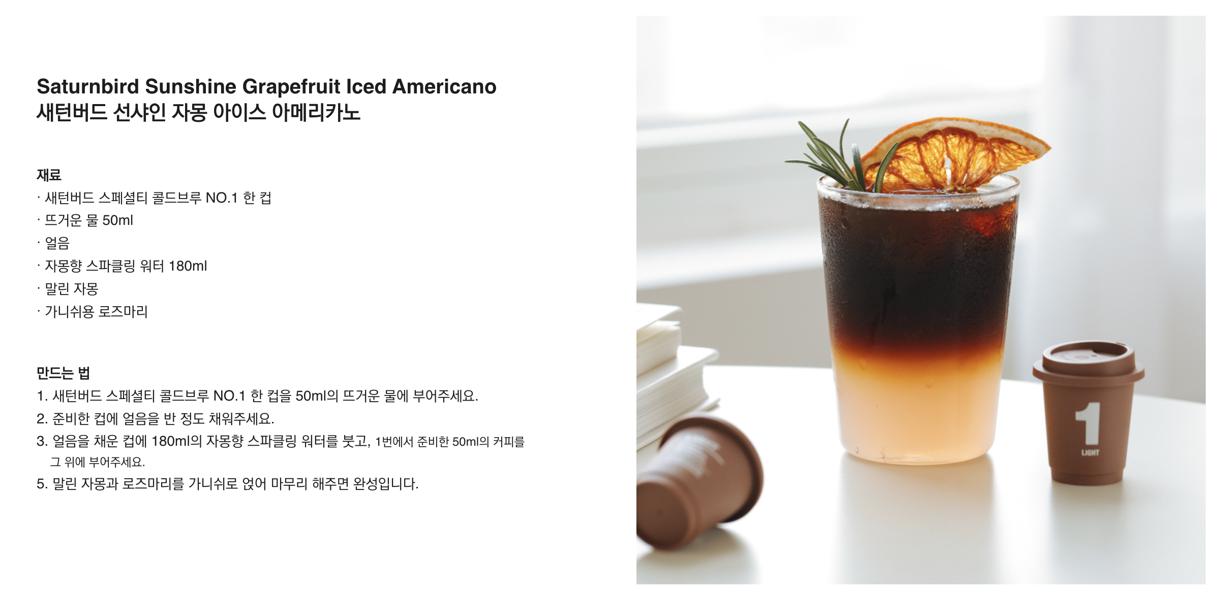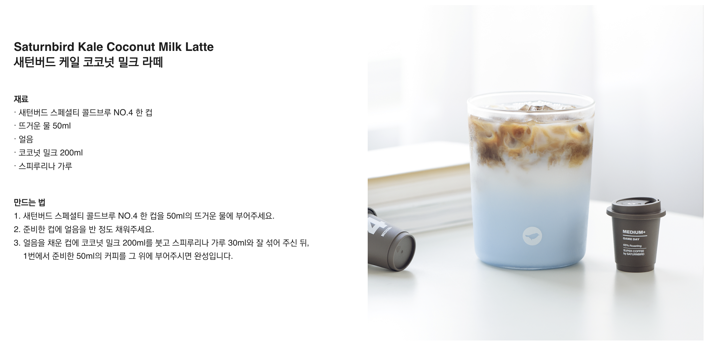제가 직접 만들어보지는 못했지만 새턴버드 커피로 선샤인 자몽 아메리카노, 민트 라임 아메리카노, 케일 코코넛 밀크라떼 등 다양한 커피를 만들 수 있더라고요.