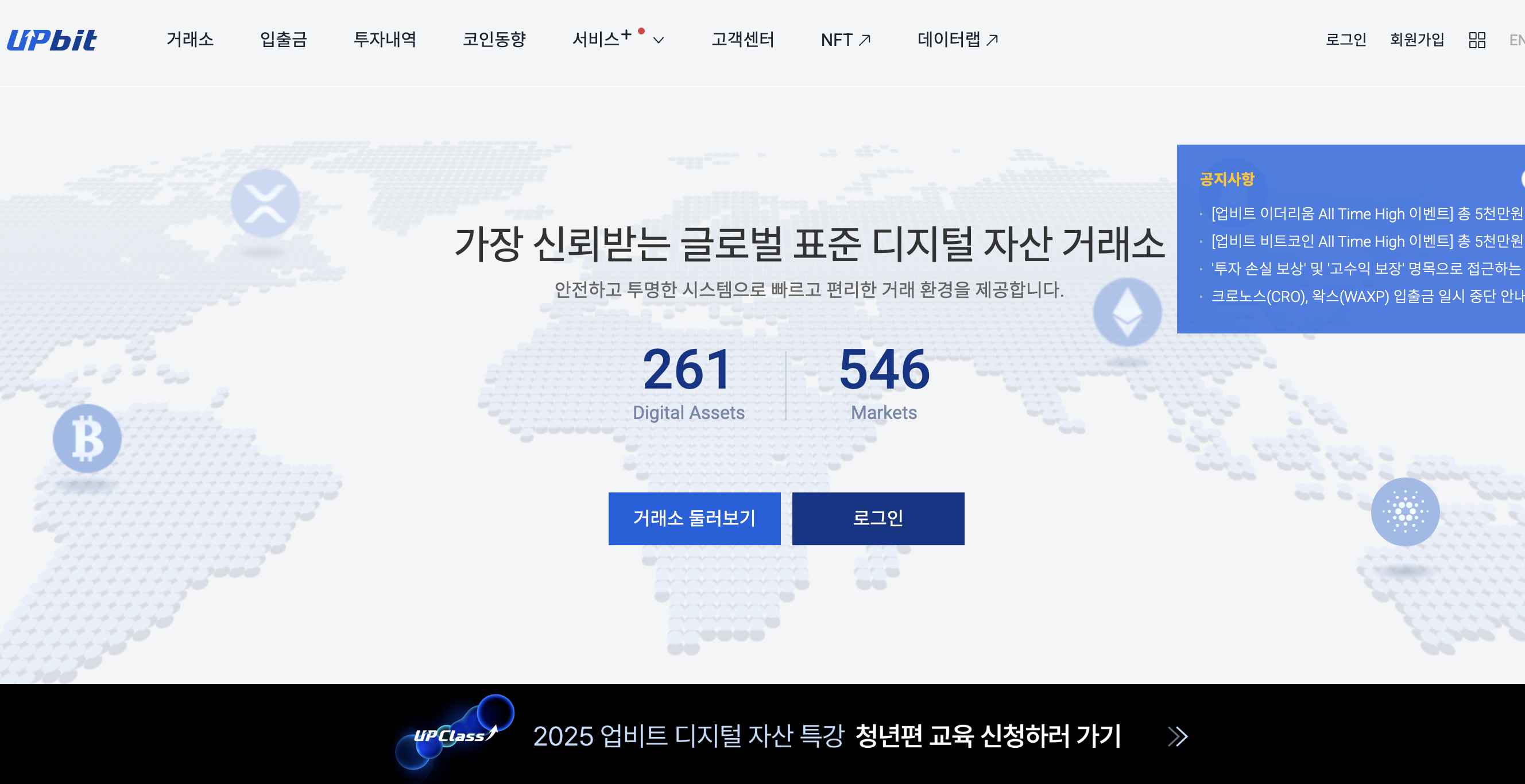 업비트는 국내에서 가장 많은 사용자를 보유한 거래소로, 원화(KRW)·BTC·USDT 세 가지 마켓을 제공합니다.