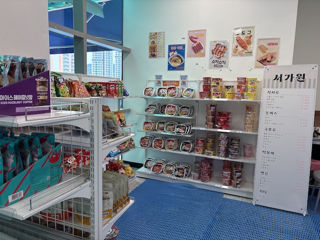 매점에서는 컵라면과 신라면, 짜파게티 같은 한강라면뿐만 아니라 과자, 뽀로로 주스, 망고 주스까지 아이들과 함께 간단하게 먹을 수 있는 식사부터 간식까지 종류가 다양했어요.