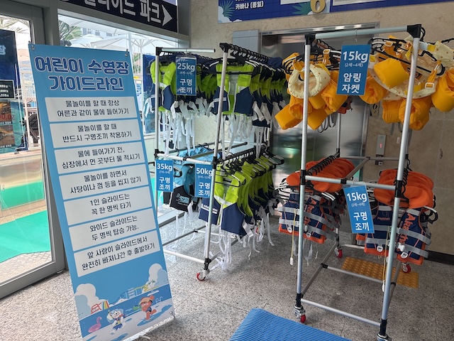 150cm 이하 어린이는 반드시 구명조끼를 착용해야 해서 6층 매점에서 5,000원에 대여했답니다.