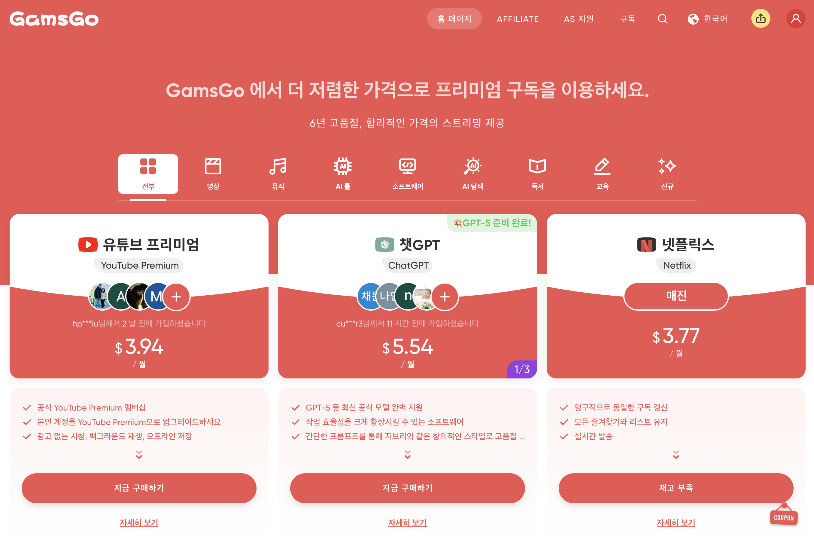 하지만 매달 정가를 지불하는 것은 부담스럽죠. 이럴 때 겜스고를 활용하면 커피 한 잔 값으로도 충분히 프리미엄 서비스를 즐길 수 있습니다.