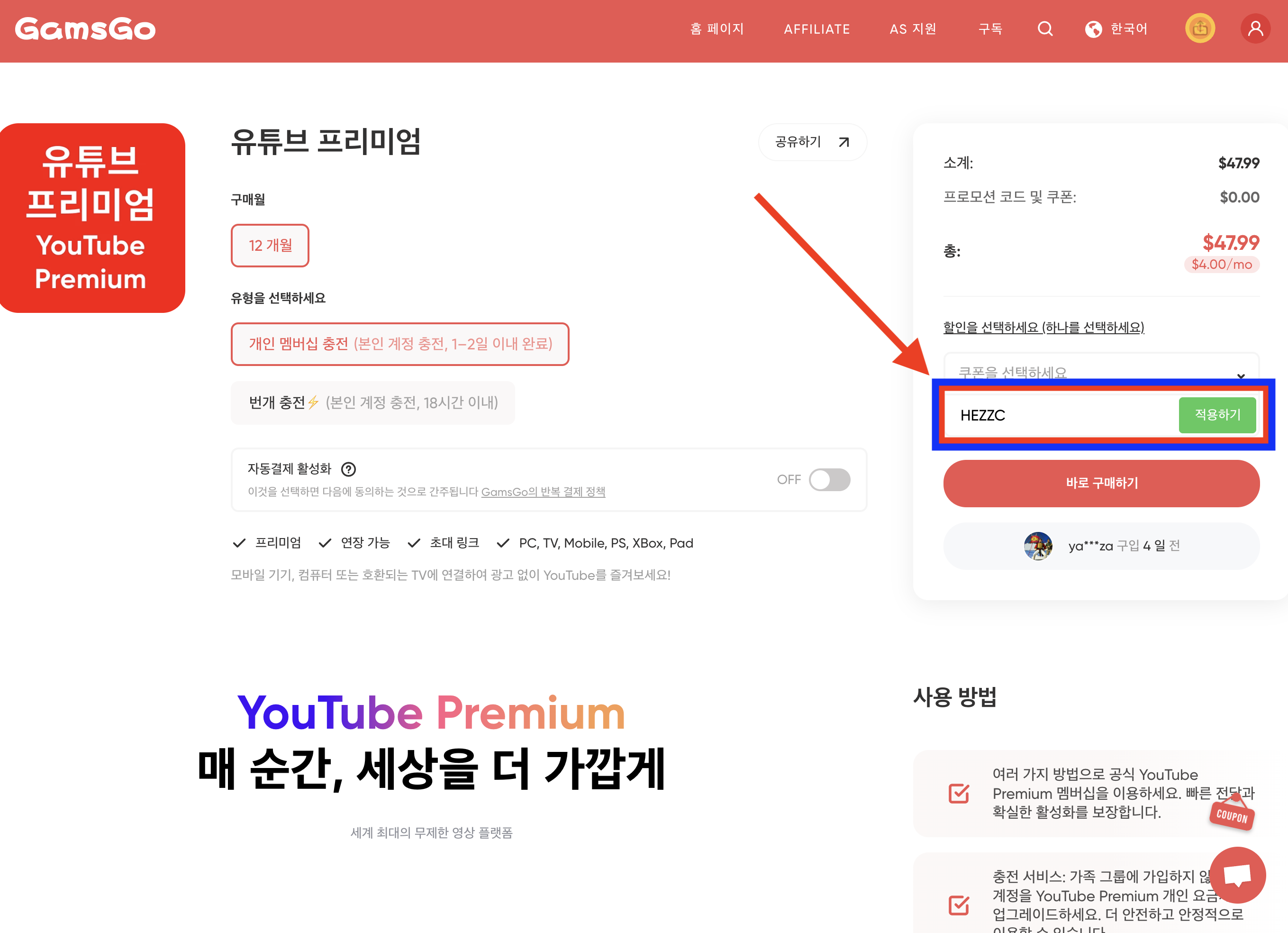 겜스고를 통해 유튜브 프리미엄을 구독하는 방법은 정말 간단합니다.