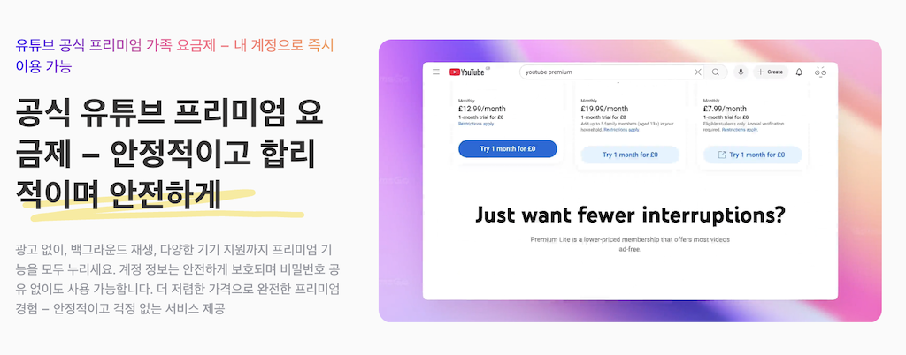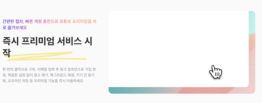 생년월일, 연락처 등 별도의 개인정보 없이 사용중인 이메일로만 회원가입이 가능하고, 유튜브 프리미엄 서비스도 바로 이용할 수 있다는 점이 큰 장점이라고 할 수 있습니다.