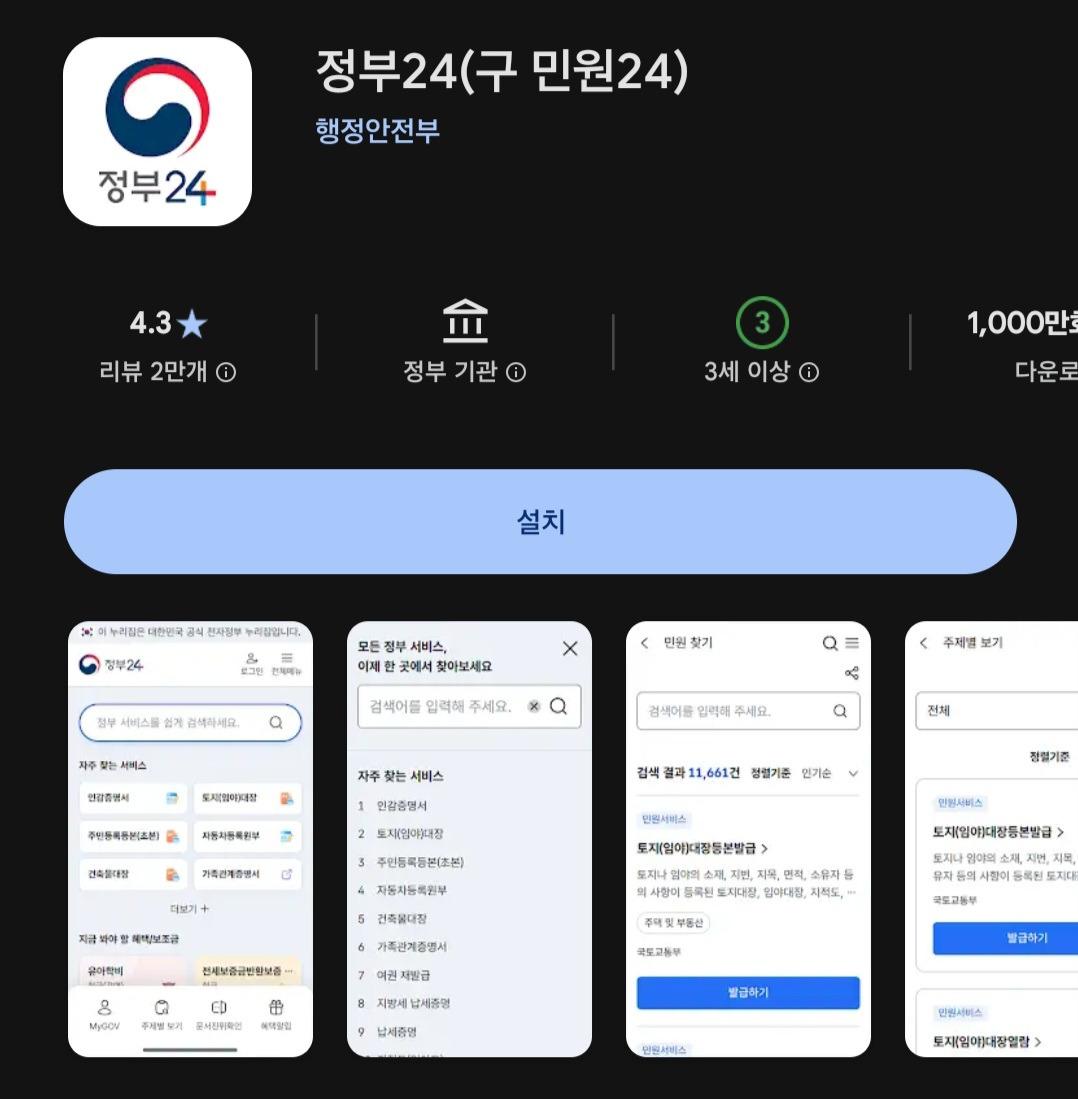 아직 정부24 앱이 없으신 분들은 아래에서 간편하게 다운로드 받으실 수 있습니다.
