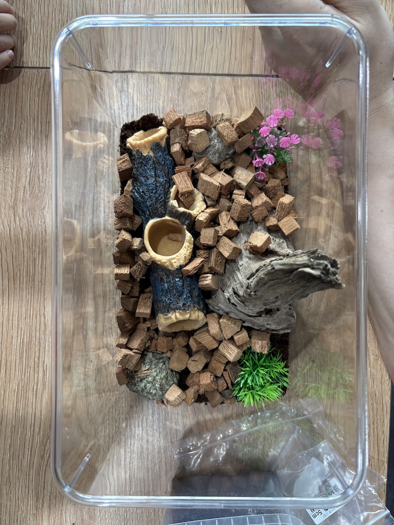 사육장은 작은 사이즈로 선택했고, 흙 + 돌맹이 + 인공 수초 + 나무토막 + 먹이통 까지 패키지로 구입했습니다.