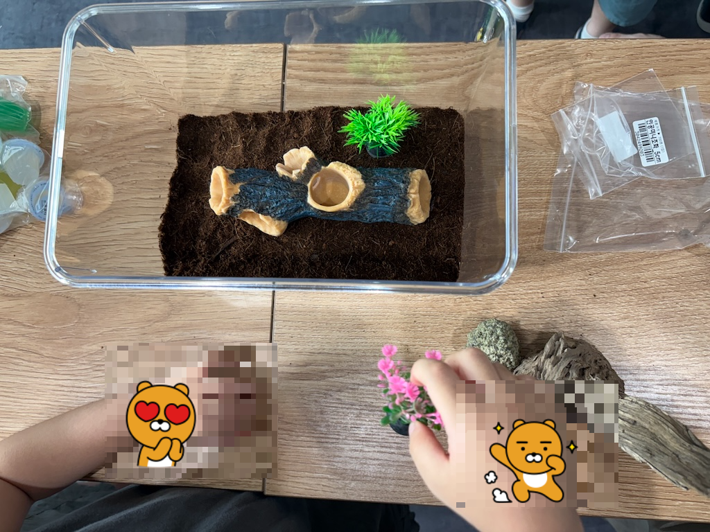 사육장을 꾸미면서 사장님께서 사슴벌레 키우는 방법에 대해 너무 친절하고 아이의 눈높이에 맞도록 쉽게 설명해 주셔서 정말 좋았습니다. 😊
