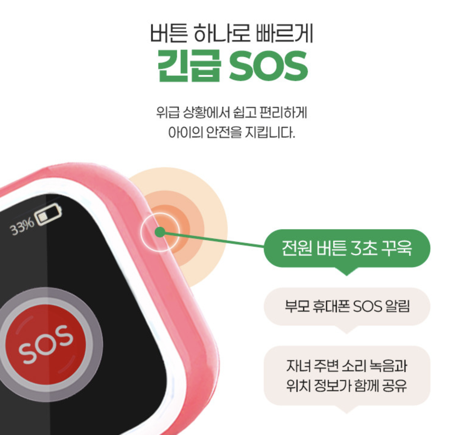 긴급한 상황에서는 버튼을 3초 누르면 SOS 기능이 활성화 되어서 부모님 스마트폰으로 SOS 알람이 울리고, 아이의 주변 소리와 위치 정보도 확인된다고 해요!