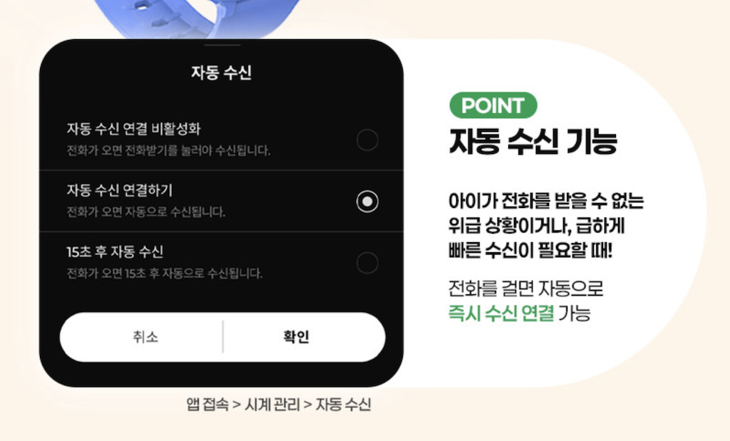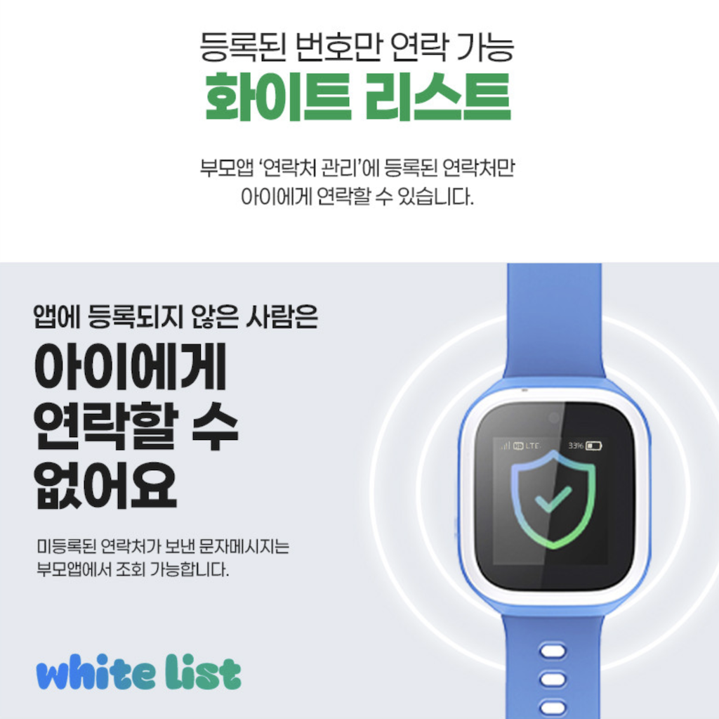 - 화이트리스트: 부모님 스마트폰에 저장된 연락처만 키즈워치폰으로 연락 가능