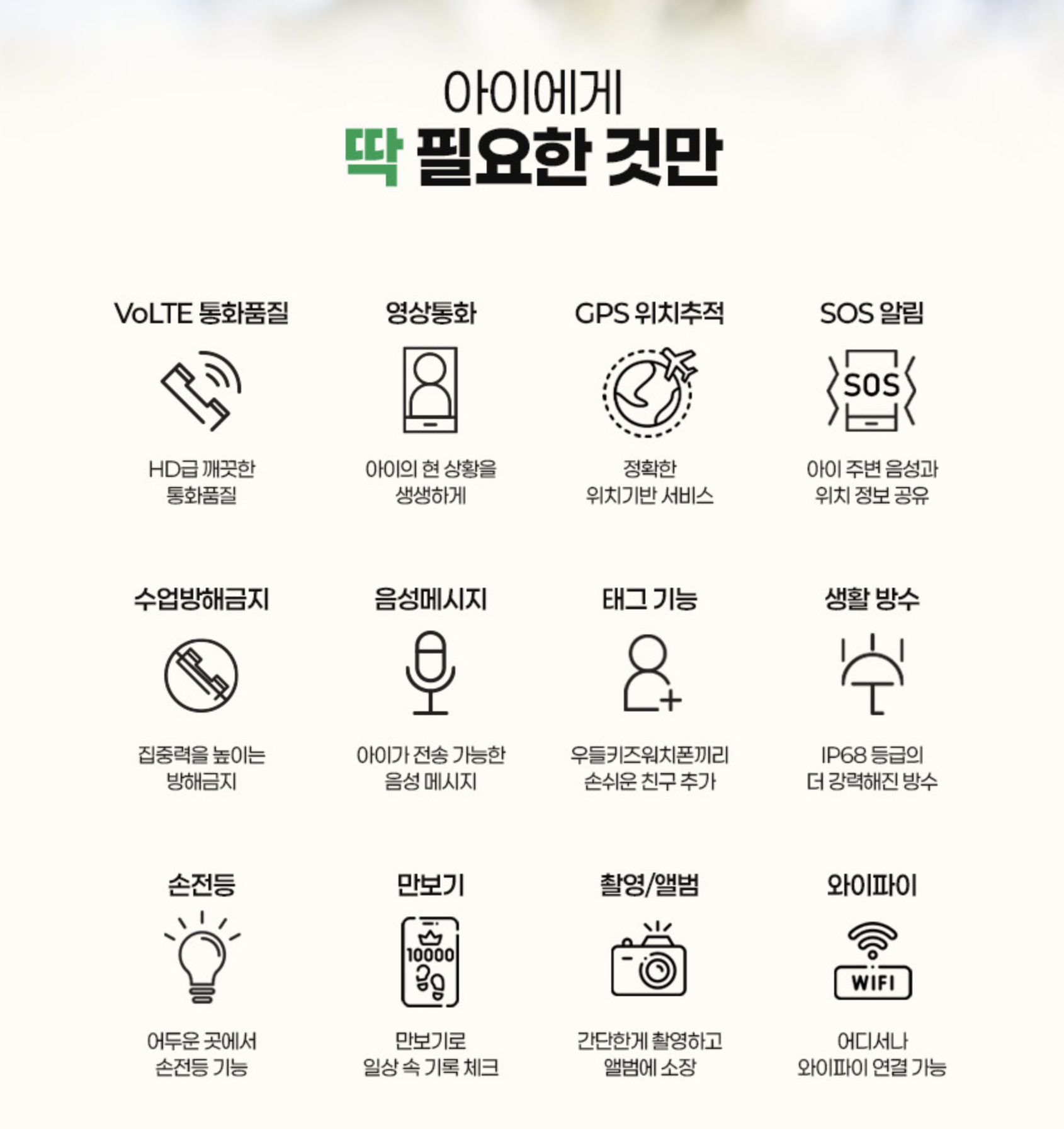 개인적으로 키즈워치폰의 목적은 통화 그리고 위치 추적을 통해 아이의 안전을 확인하는 것이라고 생각합니다.