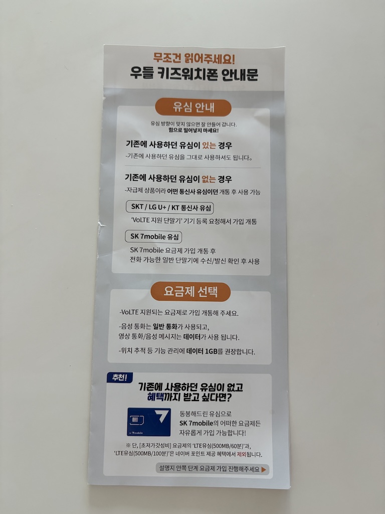 저는 처음에 키즈워치폰 설명서를 대충 보고 개통하려고 하다가 거의 1시간 가까이 허비했는데요. 부모님들이 꼭 알아두시면 좋은 주의사항을 정리해 드릴게요.